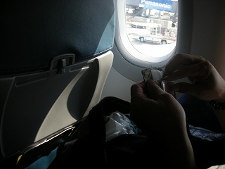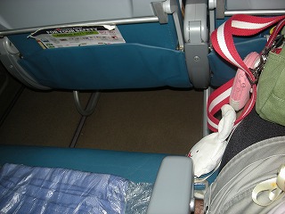 さて、機内です!しゃむねこたちは結構 旅慣れてるというかなんというか。 手荷物はさほど大きくない布製のバック 1つなのね。でかい荷物は全部トランクに 預けてしまいます。 後は退屈しのぎ用にゲーム持ってるくらい。 手持ちはなんだかんだで、がんばって 減らしております。 でもさ、見てやってよ。このピッチ幅。 下手したら冬場に乗るスキーバスより狭い。 これ、結構きついです。 |