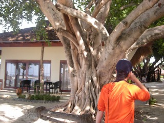 | さて、そんなわけで早速待ち合わせの ロビーに行くのですが、コテージ泊のため、 ロビーが遠いwまあそれはそれです。 大きな木が印象的です。 |