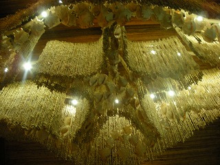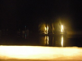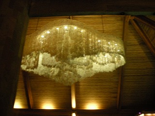そしてさっそく中に入ってみる。 なんだろう。入り口の看板はクラブみたいな感じだったんだけど、中は落ち着いた感じ。 そしてひたすら写真を撮ってしまったんだけど、シャンデリアがすごい! なんだろう。普通のシャンデリアなら驚かない。これ、全部貝殻でできてたんだ。貝殻が豊富にとれるから、 こんなに贅沢に使えるんだと言わんばかりのぜいたくな使い方だった。本当にすごかった。 あ、あとね、日本の料亭でもあるんだけど、いけすがあったんだけどね、ここの生簀はとても大きかった。 ちょっとした水族館並みだった。当然のことながらお魚を注文したらそこから持ってきてくれる。 うん。新鮮なんだけどね(^^;ちょっと気が引けた。 そして← 席から外を見た。ええ。窓なんかない吹きっさらしだったので生ぬるいです。 そしてなんで光ってるかというとお魚を取ってるんだって。網を仕掛けて複数の人でばしゃばしゃしている 追い込み漁。ってやつみたい。結構見てて楽しかった。 |