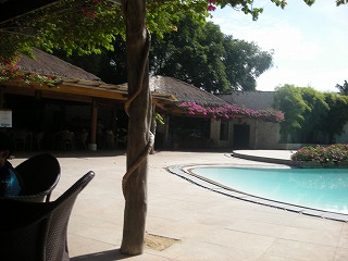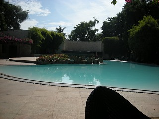 で、だよ。昨日の晩もそうでしたが、実はしゃむねこさん、今回の旅行日本円を ペソに変えたわけではなくて、米ドルをペソに変えたもんだから、結構な額を 持ってることになってしまっていたのね。で、昨夜のご飯もそうですが、朝もせっかくだから 贅沢してみようということになり、ホテルのモーニングバイキングに行ってみることにした。 これ、日本円で2000円するんよ。向こうのお金で、1人1000ペソ。 朝食に2000円かけるか?!って話で、カロリーメイトとかを、海を見ながらコーヒーのみながら かじってたんだけどね、まあいいかってことになって、せっかくだから、食べてみることにしてみた。 ええ、今回ほとんど入っていませんが少しだけ遊んだプールサイドで朝食です。 |