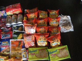 | は〜〜い、こちら 向こうのお菓子 ・オタップ(源氏パイっぽいもの) ・OISHI(かっぱえびせん的な?) ・ドライマンゴー ・ビール |