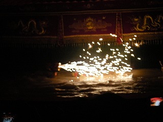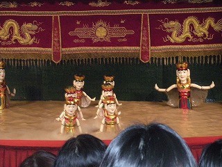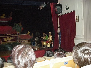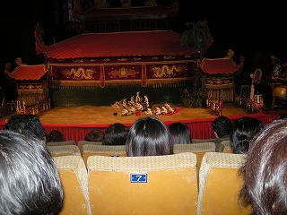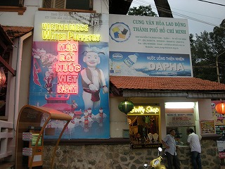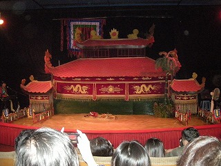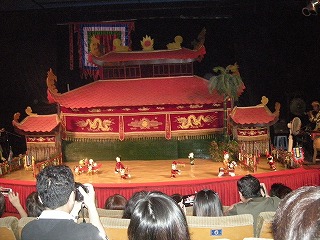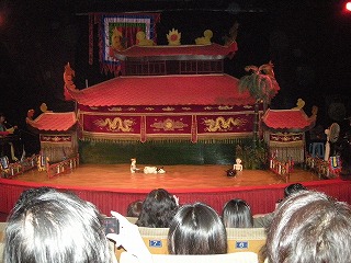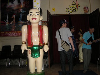 | 街中に移動して、今度は水上人形劇に移動。 ベトナムの伝統芸らしい。 で、ここがその劇場なんだけど、なんともシュールな人形がお出迎え。結構な大きさでしたよ。↓の写真で人間と比較してみてね。 |