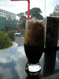 | 買出し終わって、ちょっと休憩。百貨店の中のスーパーって事もあって、他の階にいったら喫茶店もありました。 こちらで、休憩という事で一息入れたんだ。そこで私はジャスミン茶、相棒はコーヒーを頼んだんだけどね。ジャスミン茶に蜂蜜は入っていた(−−; こっちの飲み物は本当に何でも甘い。 そして、相棒の頼んだコーヒーですが、南国特有の薄さは想定内だったんだけど、あわ立つほど甘い。defaultで甘い。自分でガムシロップを入れる とか言う感覚はなくて、全部が甘い。虫歯になりそうなくらい甘かったw |
