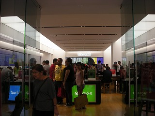 | ↑のような看板っていうか、ちょっとした表札? のようなのが結構好きなんだよね。外国!って 感じがしませんか? で、早速散策していたら、面白いもの発見! macストアの前に、Miclosoftのストアがあるw さすがアメリカこんなのもありってことか それぞれのお客さんの入り具合を写真でUP どっちも同じくらいでしたwおもしろい。 |