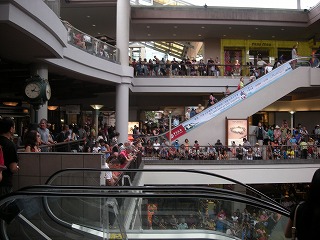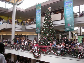 上のクリスマスツリーのところが、メイン広場なのか、下にステージのようなものがあって、歌手が歌ってた。 結構綺麗で気に入ってちょっと聞いていたら、うえからシャボン玉が!っていったら聞こえいいけど、何だろう、台所洗剤の泡(塊・小)が大量に ふってきた。確かに降らそうと思ったら【シャボン玉じゃ無理だよね】ってことで泡の固まりになったんだろうか?・・・・ あ。歌っているのがクリスマスソングだから、雪の代わりなのか?と少し思いました。 この後各種ブランドショップを回って、お店を回ったんだけど、不思議だったのが、セーターとか、ムートンのブーツとか売ってるの。 今の私の格好、ジーンズに長袖Tシャツ。ええ、暑いです。なんでセーターとか売ってるのか正直わかんなかった。 なんだかんだで時間つぶしてたら、相棒のおなかが痛いということ+ホテルからチェックインしていいよ〜と 呼び出しがあった(チェックイン時にポケベル(特大)を貸してくれる)のでホテルに戻ることにしました。 途中相棒のお手洗いに立ち寄るんだけど、なんかドアが閉まらなかったり、水が流れなかったりなどで実質使えるトイレがなかったらしく、結局 ホテルの部屋まで我慢してました。カワイそうに(^^; |