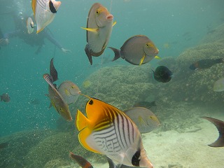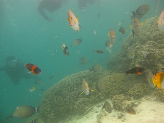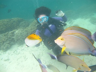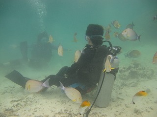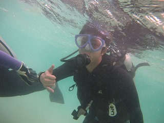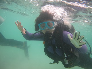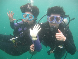 | うお〜〜〜なれてきた!久しぶりだ! 天気があまりよくないので、視界がいまいちなのが残念ですが、それでも思い出せれば楽しい。 中性浮力を思い出せず、降下にちょっと苦労w目とかつぶっちゃってますが、結構楽しんでおります。 一緒にもぐった人は結局4人。ダイビングツアーに申し込んだ人って私たちと後もう一組しかいなかったみたいです(^^;;;人気ないのかな |