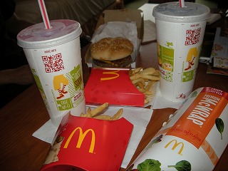 | トロリーバスで帰ってきて、ホテルの近くのマクドナルドに行ってみました。 どんなのがあるんだろう?って思ったのと、【はずれのご飯を食べたくないよね】ってことで、こうなりました。 本当はロイヤルハワイアンショッピングセンターででも食べれたらよかったんだけどね。 |