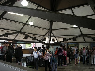 | 空港内ですが、自然も豊かです | 荷物受け取り中。 ここはどこでも同じ なんだけど、人より、荷物が先に出てくる(^^; それだけ人少ないんだろうね。 |