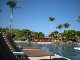 青〜い空に雲もなし〜 ハイビスカスが咲き乱れ〜ですよ。 ビーチの椅子にとりあえず、ごろりと。 一回水に浸かってみたんだけど、 冷たい(><) 朝9時からのプールは無謀だったか?w |