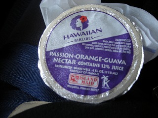 そしてさっくりと搭乗。コナ空港かホノルル空港 に移動します。今回もハワイアン航空の お世話になります。 約1時間ほどの旅。 でも思ったんだけどさ、1時間ほどって、 飛行機で関西から、南九州くらい と同じなんだよね。そう思うと結構離れてる と思った。 そして←なんか毎回いただくジュース。 グァバ味?トロピカルフルーツ系の味が してそこそこおいしいです。 |