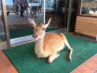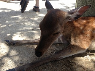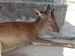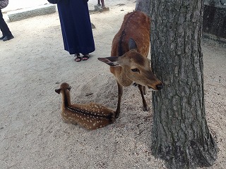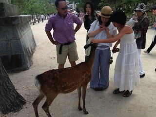 | ある程度観光も終えて、くたびれてきたので(相棒がね) 島も見るところは見たしってことで締めのあたりに戻ってきました。 ここにはたくさん鹿がいたので、ちょっと触れ合ってみることに かなり近くまでよっても逃げない。てか、人なれしてる。 休憩でそこらへんに腰掛けて、ビール飲みながらぼ〜〜っとしてたんだけど、持っていたコンビニの袋に鹿が頭を突っ込んできた! めっちゃびっくり。中身は食べ歩きした後の、練り天の棒とか、もみじ饅頭の包み紙とかだったんだけど、こんなものでも反応するのね(^^;; なんか申し訳なかった。 |