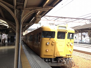 ←【この旅最大の壮大なるがっかり!】なんですが。。。。。 呉の駅って、電車が来るときの音楽が【アニメ宇宙戦艦ヤマト】のオープニングの曲なんだけどさ あの壮大なトランペットの、ちゃ〜んちゃ〜ちゃちゃ〜んちゃららちゃっちゃちゃ〜〜〜♪で始まって おぉ!どんな電車がやってくるんだ?!カッコいいじゃないか呉駅!さすがヤマトミュージアムの お膝元!と期待して・・・で、歌詞の「さらば〜〜地球よ〜」の 直前のちゃ〜〜〜んん。。。。。で!電車がホームに入ってきて! で、やってくるのが←と。 ・・・・・黄色い小さいかわいい4両編成の電車が来ると。 ・・・・・・・・・・せめてさ。USJ行きの電車みたいにイラストくらい描いておこうや。。。。。。 あれだけ壮大に電車の到着を盛り上げておいて、で、これよ。小さくかわいい黄色よ。 ヤマトの波動砲を撃てそうなイラストとはいわない。せめてさ、沖田艦長とかさ・・・・・orz |