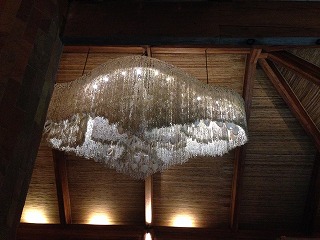 そしてさっそく中に入ってみる。 なんだろう。入り口の看板はクラブみたいな感じだったんだけど、中は落ち着いた感じ。 そしてひたすら写真を撮ってしまったんだけど、シャンデリアがすごい! なんだろう。普通のシャンデリアなら驚かない。これ、全部貝殻でできてたんだ。貝殻が豊富にとれるから、 こんなに贅沢に使えるんだと言わんばかりのぜいたくな使い方だった。本当にすごかった。 あ、あとね、日本の料亭でもあるんだけど、いけすがあったんだけどね、ここの生簀はとても大きかった。 ちょっとした水族館並みだった。当然のことながらお魚を注文したらそこから持ってきてくれる。 うん。新鮮なんだけどね(^^;ちょっと気が引けた。 そして← 席から外を見た。ええ。窓なんかない吹きっさらしだったので生ぬるいです。 そしてなんで光ってるかというとお魚を取ってるんだって。網を仕掛けて複数の人でばしゃばしゃしている 追い込み漁。ってやつみたい。結構見てて楽しかった。 |