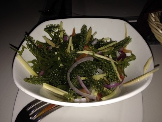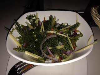 | で、ごはんね、早速かき頼んでみた。 ニンニク味の濃い感じ。結構おいしい。 そして当然片手にサンミゲル。 あと、ガイドブックで見ていたこぶサラダも注文 ↓ね。海ぶどうとしょうがに、みょうが。 あ、これおいしい奴だわ。でした。 これ、日本でも作れないだろうかと 本気で考えた。 |