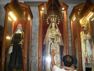 | 「サント・ニーニョ」とは「幼きイエス・キリスト」という意味で、 戦火の中でも無傷だったことからセブの守護神として崇拝されているそうな。 子の幼いキリスト像はものすごい行列だったので横顔を拝見。 これだけでも充分嬉しかったです。 歴史ある建物というのもいいけど、ここだけかおるヨーロッパの雰囲気がいい。 アジア圏に旅行に行くとたまに思うのが、ヨーロッパの植民地だったところは ヨーロッパの文化が垣間見れて結構好きだったりします。 アジアはアジアでいいんだけどね。アルタヤとかもすごく好きだし。 なんにしてもよ!ミサをやっていない時間だったから、教会の中を写真撮影 できて相当嬉しかった! そしてガイドは相変わらずいまいちw |
