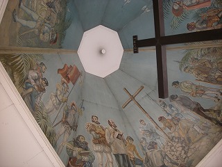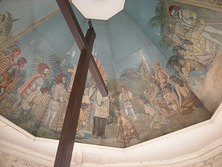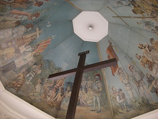 | さて、なかみ。だからなんだと言われたら困るんだけど、十字架(木)です 天井絵は事前にガイドブックで拝見したものより現物は美しい!なんともいえない素敵な姿。 現在公開されているクロスはイミテーションで、本物は地下にあるそうで(書いてあった) なんというか、The大航海時代! うぉ〜〜〜〜〜〜〜〜〜!!!!!と無駄にテンションが上がるんだよね。何でだろうね。ヨーロッパ行ってみたいなぁ。 |