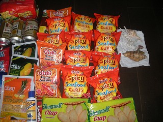 | は〜〜い、こちら 向こうのお菓子 ・オタップ(源氏パイっぽいもの) ・OISHI(かっぱえびせん的な?) ・ドライマンゴー ・ビール |
