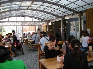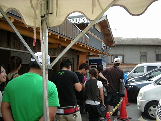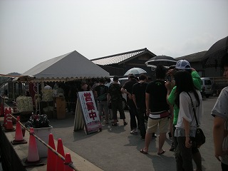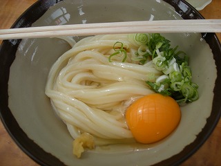 で!順番が来て、暑いので、当然、かけうどん 冷うどんをチョイス。 ←ってことで、湯がいただけのうどんに、生卵を 乗せてもらって、200円なり。これに醤油を かけて食べます。 結構いけるんだよね。 さて、うどんも2皿食べたし、移動します〜 |