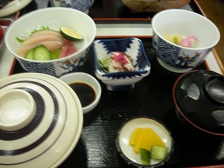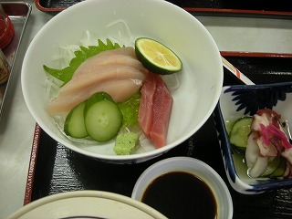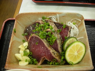 | 人が多いんだか、少ないんだか。。。。。お土産屋さんが食堂をしているところが大半でした。 そんな中で1件入ってみて、そこで食事。 正直刺身定食の刺身はいまいちでしたが、かつおのたたきはおいしかった! うん。いいものだ。 |
