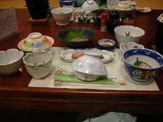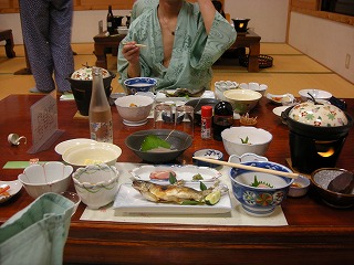 | 周りに食べるところが本当に何もないので、本日はお宿で夕食。 ・・・・・・・・・・・・・・・・・・ なんというか、隠れ里だからか、素材がないのか・・・・・・・。。。。。。。。。 どっちかっていうと、普通。大阪や神戸のレストランの方がおいしい。 ここはご飯というよりも、温泉や景色を見るところでした。それでも豪華な夕食でしたよ。 |