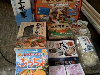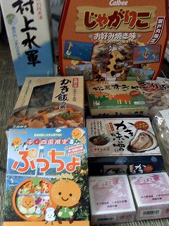 今回の旅行のお土産の山です〜♪ 相棒のTシャツがイチバン気に入ってるんですけどね〜 女性ものがありませんでしたT-T このTシャツ村上水軍の旗印になっていて、今回の旅行の端々で 見かけました。 あと、おいしかったのは塩飴かな。結構いける! |