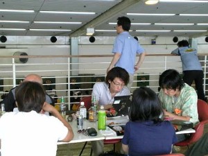 | 会場での一こまです。おのおの出番まちだったり、お弁当食べてたり、応援してたり。 お酒が現場で販売されてるからね。結構また〜りとしながら、すごしています。 私はって言うと、このHP用の写真を一生懸命とってたんだよ〜(w |
