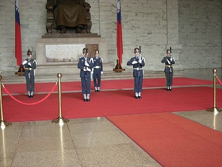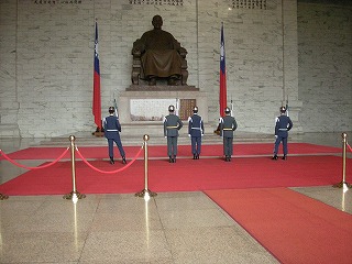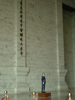 | そして民主記念館の中です。 蒋介石という人の像がででん!っと飾ってありました。その横にやっぱり兵隊さんが! |