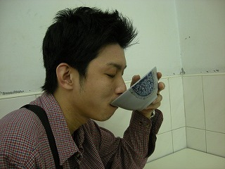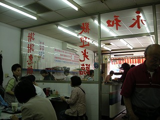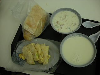 | 注文したのは 相棒が揚げパン?と甘い豆乳 私が塩味の豆乳(ってか湯豆腐)と玉子焼き。 どちらの組み合わせも台湾では一般的な朝ごはんで、周りの方もたくさん食べてました。 二人で85元なり(255円だね)私が食べた湯豆腐のような豆乳のような。。。は結構おいしくて 目新しいのもあったからかもしれないけど、ホテルの朝ごはんより好きだったな。卵焼きもね、 小麦粉と玉子をまいた感じで、おなか膨れるのね、味もさ、塩味で食べやすいのね。 結構気に入りました! |
