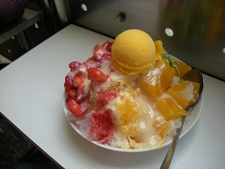 で、代わりにミックスというやつを頼んでみた。 キーウィーとイチゴは生のものだったけど マンゴーは本当に無いんだろうね。 マンゴーゼリーが乗ってました。 で、私ですが、こんなに大きなカキ氷を食べる 自信が無かったので、暖かい台湾ぜんざいを いただきました。白玉が入ってることを期待 したんだけど、残念ながら何も入ってません でしたよ(TT |