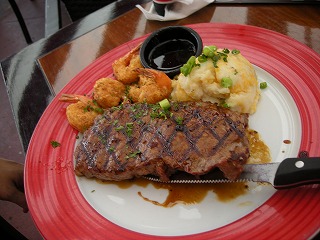 ←左が相棒が頼んだ「肉の塊w」 右が私が頼んだ「軽い目の昼食w」 ・・・・・いや〜・・・さすがあめ〜りかん♪ww もう笑うしかないーー; 肉の塊。。。本当に肉の塊です^^;もう少し やわらかいほうがいいな〜−−; ハンバーガーに挟まってるものはチーズを フライにしたもの。・・・・なかなか濃いです |