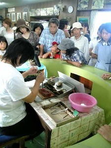 | クルージングの最中に、ミキモト真珠工場 の近くを通るのですが、なぜか、別の真珠 加工所みたいなところで、見学会(w なんか、丸い玉みたいなのを (結構でかい)貝の中にいれて、 それだけみたい。その説明を延々と。。。^^; |