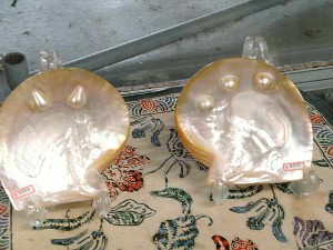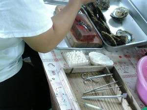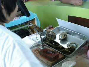 | クルージングの最中に、ミキモト真珠工場 の近くを通るのですが、なぜか、別の真珠 加工所みたいなところで、見学会(w なんか、丸い玉みたいなのを (結構でかい)貝の中にいれて、 それだけみたい。その説明を延々と。。。^^; |