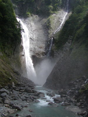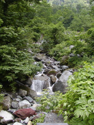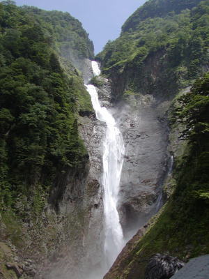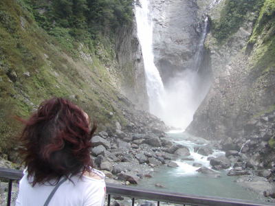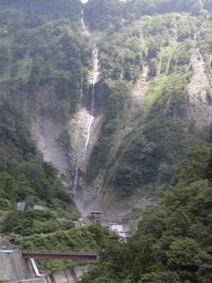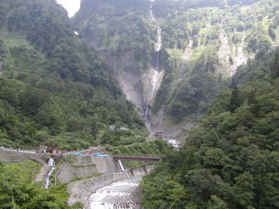 黒部ダム?に立ち寄ってきました。ダムの観光コースに行こうといわれたのですが、 なんか疲れてしまってて、滝の部分だけ見学してきました。 自然の中に歩道があって、遠めに滝が見えてます。そこまで歩いていくんだけど、見えてるから速攻でつく! とか思ったのが間違いの元でして。。。。歩くこと40分くらい(^^;結構疲れます。 滝の近くに駐車場があって、そこから歩くんだけど、歩き出したら暑いの何の! さすが真夏は伊達じゃないよーー#って思ってたのもつかの間。 滝に近づけば近づくほど気温が下がっていくのが肌でわかるんだよね。ついたら肌寒い(w これ風邪ひくよ。マジで で、滝の目の前のつり橋で、TMレボリューションごっこをするバカ一人(w 水の流れ落ちる勢いでか、すごい風圧で、(上の私の写真でわかるかな?)TMレボリューションのステージセットみたいでした。 自然ってすごいもんですねぇ。本当に涼しかった |