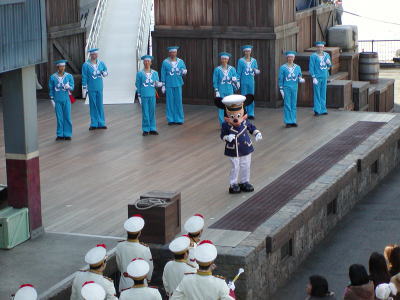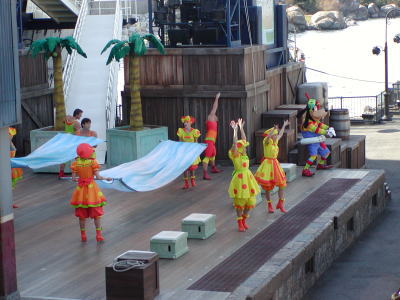 豪勢なお昼ご飯も終わって、外に出てみると、お船の甲板で(レストランがお船の中にあったんだ)なんかショーしてるし!
